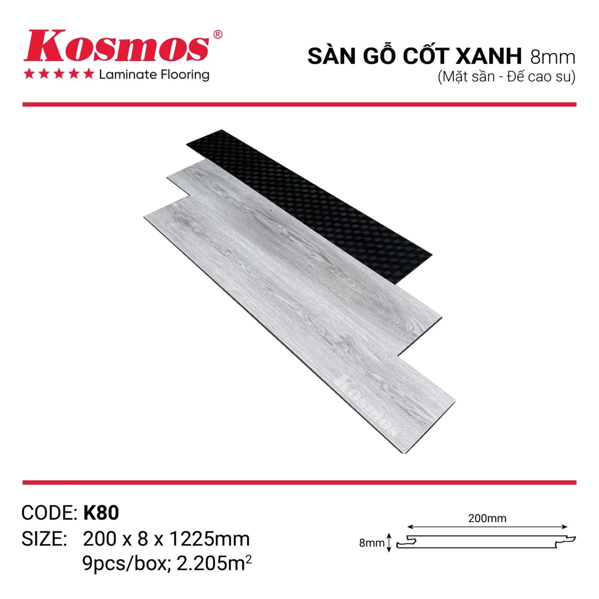 Cốt xanh chịu nước: Sàn gỗ Kosmos K81 đảm bảo an toàn cho sức khỏe và thân thiện với môi trường. Cốt xanh có khả năng chịu nước vượt trội thích hợp sử dụng cho các khu vực có độ ẩm cao như phòng bếp, nhà vệ sinh.