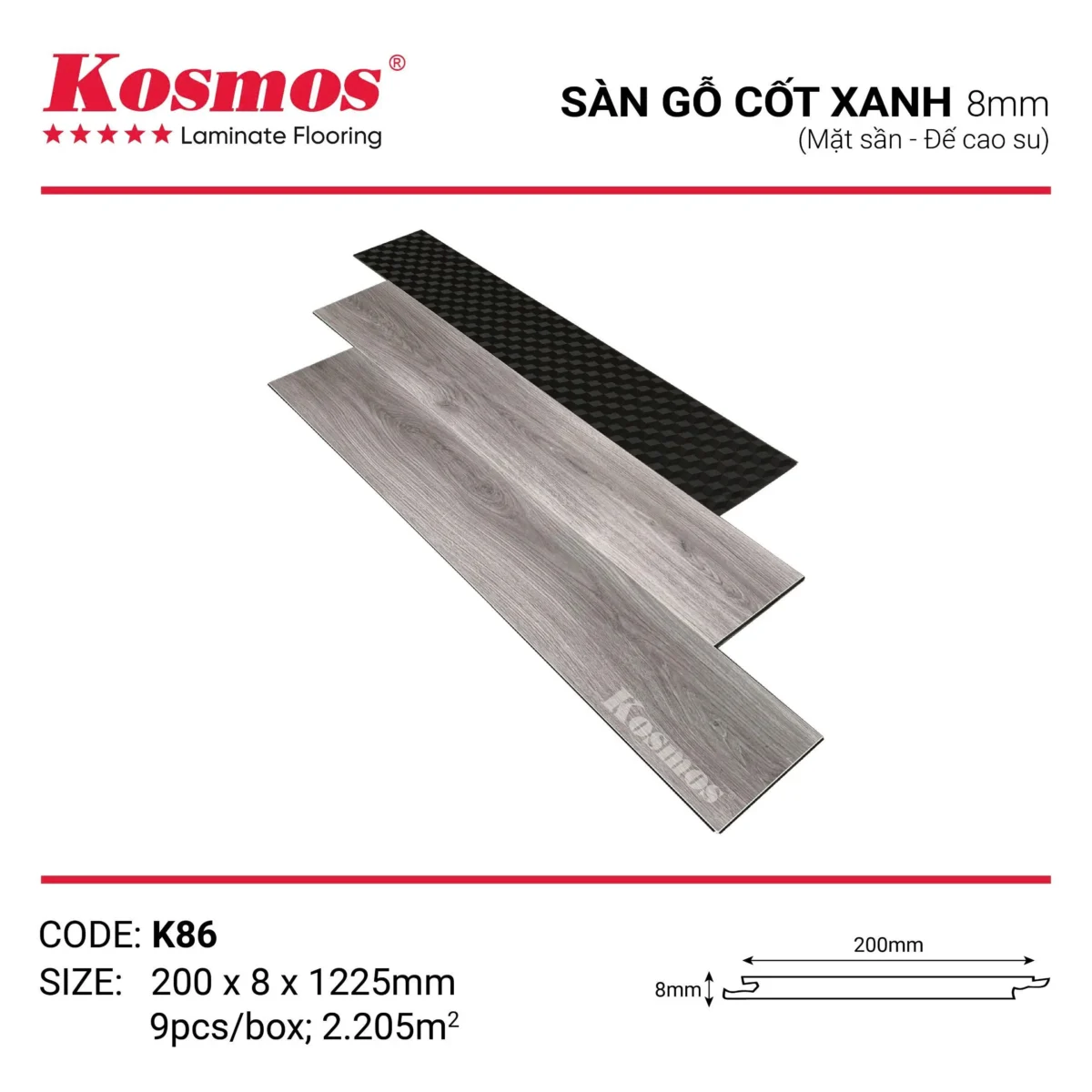 Cốt xanh chịu nước: Sàn gỗ Kosmos K86 đảm bảo an toàn cho sức khỏe và thân thiện với môi trường. Cốt xanh có khả năng chịu nước vượt trội thích hợp sử dụng cho các khu vực có độ ẩm cao như phòng bếp, nhà vệ sinh.